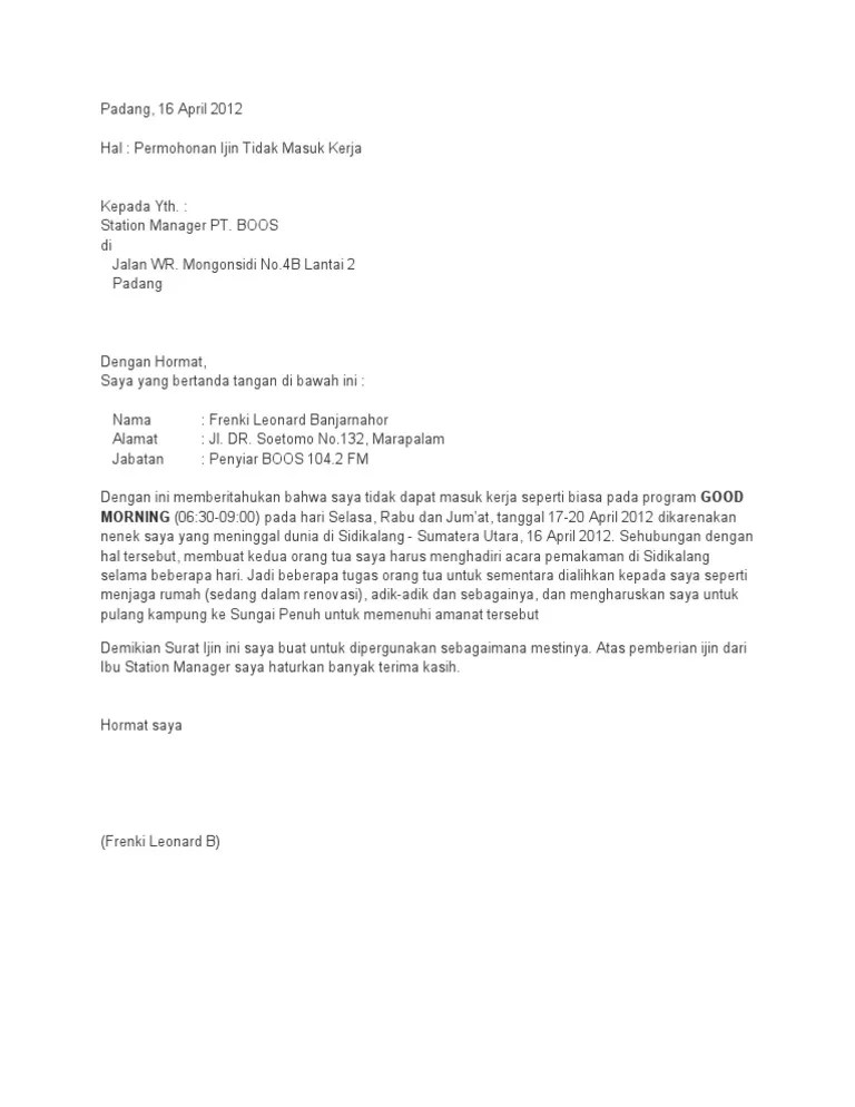 Hal tersebut dikarenakan ada kepentingan urusan keluarga yang sangat mendesak dan harus saya hadiri. Surat izin sakit perlu disampaikan agar seorang. Itulah 6 contoh surat izin yang mungkin bisa menjadi rujukan untuk anda yang berhalangan hadir ke kantor atau sekolah, serta izin urusan lainnya. Contoh surat izin kerja yang benar dan cara membuatnya. Nah, jika kamu kebetulan sedang ada urusan keluarga yang tidak mungkin ditinggal, ini saya kasih contoh format hadi kusumo adi nip. Anda pun bisa meminta izin kepada atasan dengan menggunakan contoh surat izin tidak masuk kerja pns karena urusan di bawah ini. Jika pada bab sebelumnya kita telah membahas berbagai macam contoh surat resmi dan dinas. Surat izin kerja adalah surat yang memberitahukan kepada atasan kita bekerja mengenai keperluan mendesak yang membuat kita tidak bisa melakukan pekerjaan. Urusan keluarga yang kerap membuat kita untuk membuat surat izin adalah adanya anggota keluarga yang sakit, meninggal dunia, menikah hal inilah yang mendasari para orangtua mengambil cuti dari kantor mereka untuk sekedar membawanya ke dokter maupun menjaganya hingga sembuh. Apalagi jika sudah berkeluarga, ada saja urusan keluarga yang. Surat izin karena urusan keluarga. Disebut surat pribadi karena ditulis perseorangan dan dinas karena jadi, dapat dikatakan surat izin menyangkut urusan pribadi dengan instansi atau lembaga. Surat izin tidak masuk kerja kepada yth.