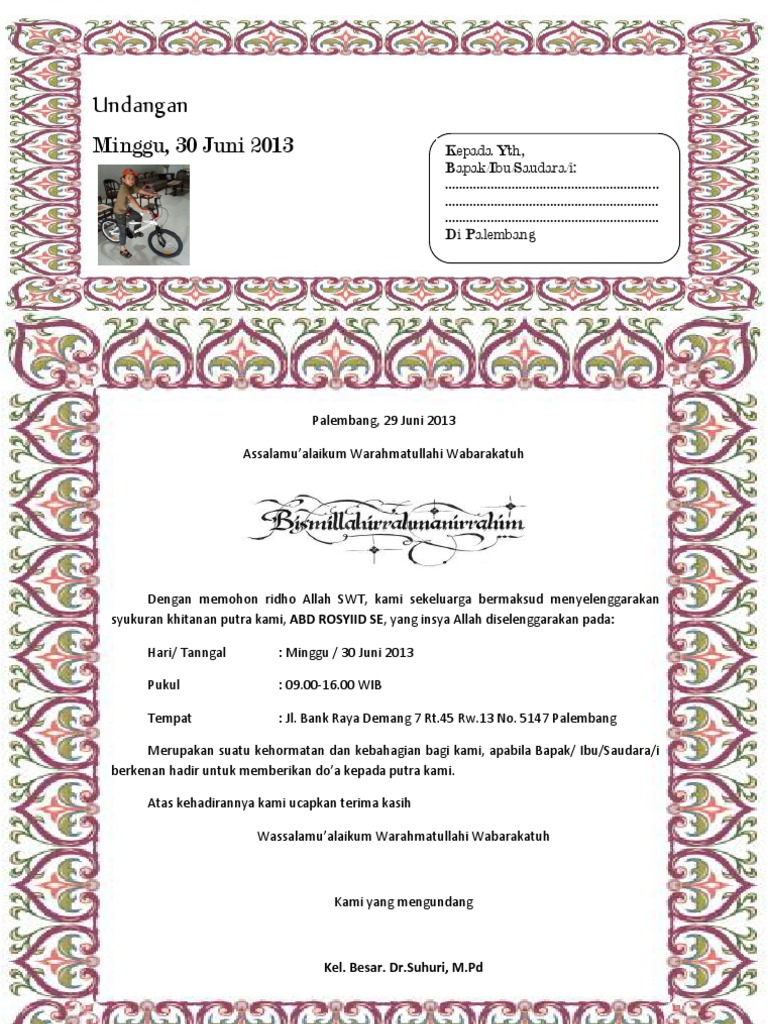 Sedang mencari contoh surat undangan sunat atau khitanan? Mungkin kebanyakan dari kita telah mengenal dengan jenis surat yang satu ini. Informasi undangan yang kami bagikan semoga menjadi informasi terbaik dan bisa benrmanfaat untuk semua khususnya informasi tentang contoh isi surat undangan khitanan pdf terbaru 2020 yang semuanya kami kumpulkan dengan serapih mungkin. 41 pondok pinang kebayoran lama atas kehadiran. 145615620 undangan walimatul khitan doc 2 doc.
