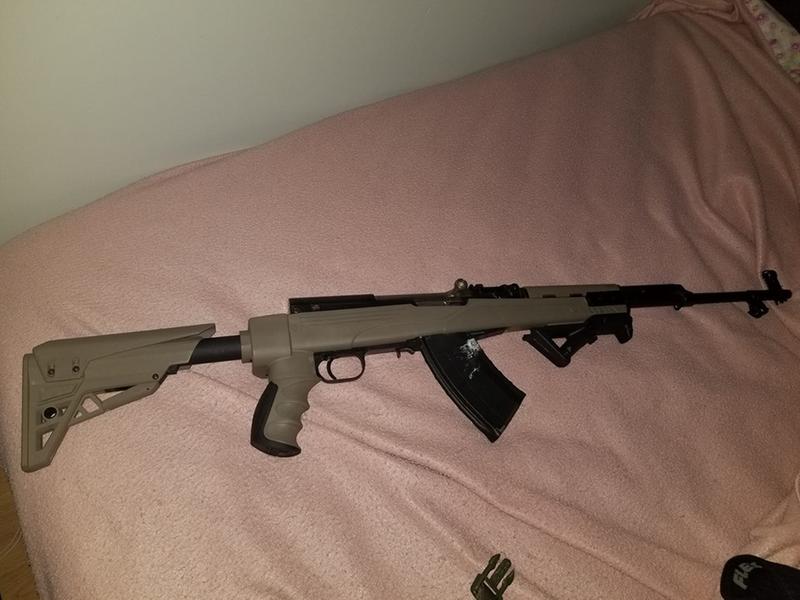I replace the stock with a folding composite stock and swap out the 10 round mag for a 30 round mag.